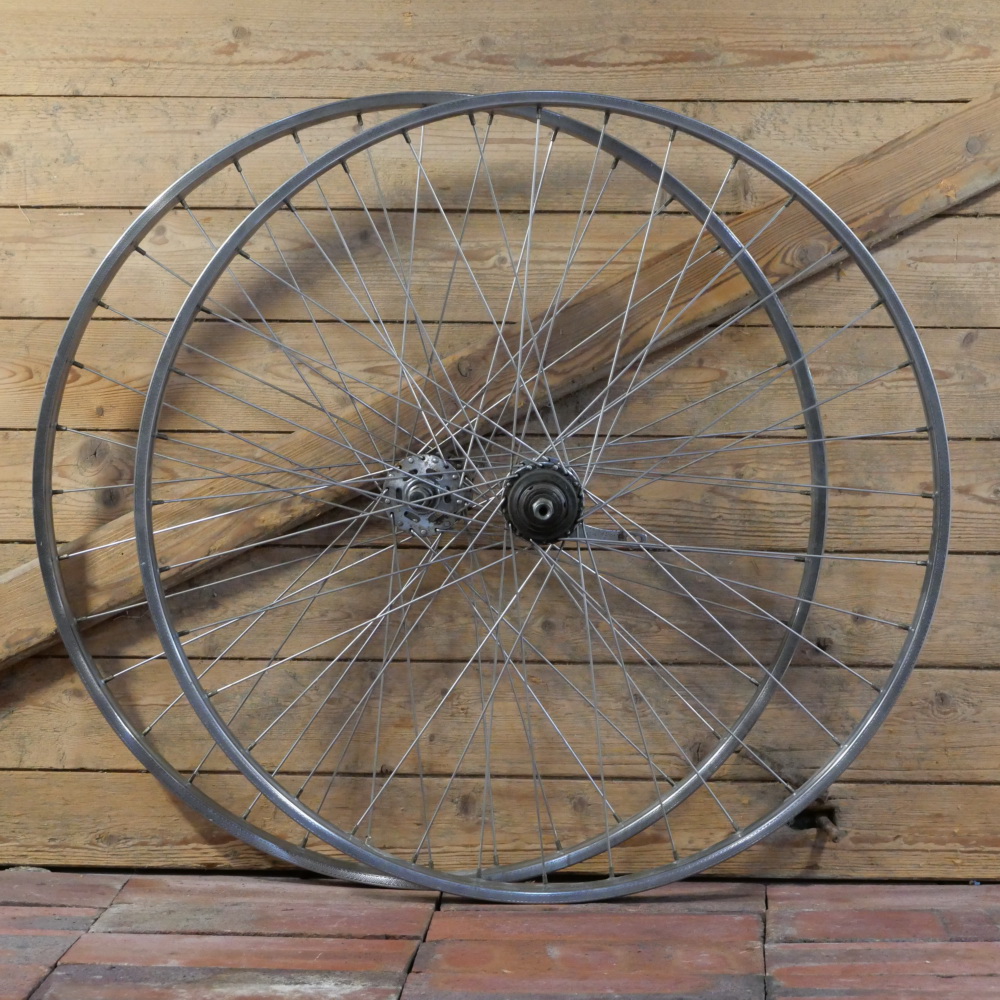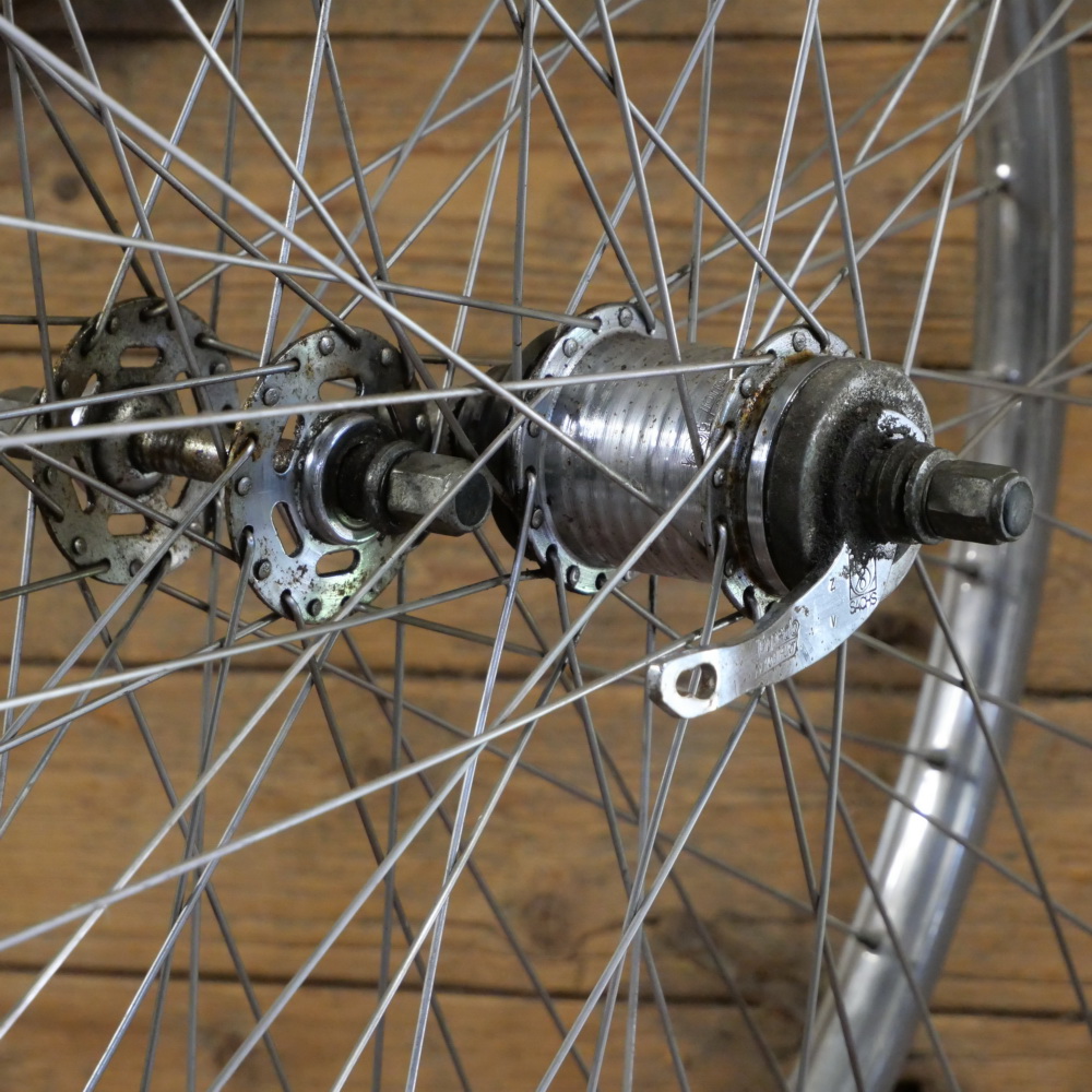 Laufradsatz 28 Zoll (622) WEINMANN Nirosta für Drahtbereifung, original 70er/80er J., Hinterrad mit Torpedo 3Gang-Nabe, gebr.