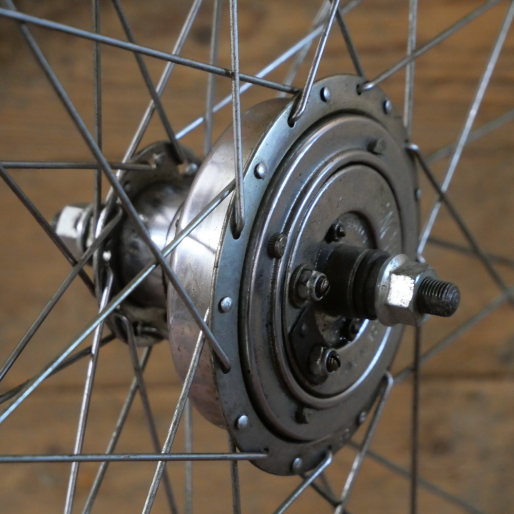 Vorderrad 28 Zoll (622), 1975, REGIDA Superchromix Drahtreifenfelge, Stahl verchromt, Breite 28 mm, Nabe: STURMEY ARCHER Dynahub, verchromt, Einbaumaß: ca. 94 mm, Speichen 2 mm verchromt, gebraucht, technisch o.k., Zustand gemäß Fotos