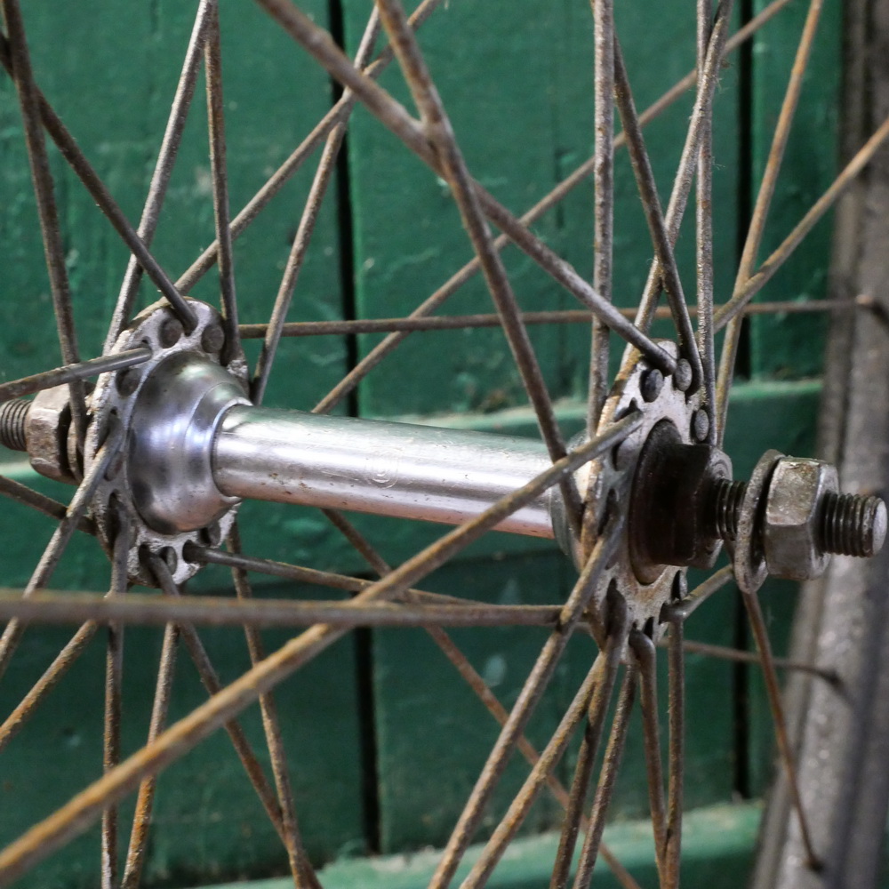 Vorderrad 28 x 1,75 (622), Stahlfelge für Drahtbereifung, 1950/60er Jahre, Breite ca. 35 mm, schwarz überstrichen, Speichen 2 mm verzinkt, Nabe "Union" verchromt, Einbaumaß 90 mm, deutliche Patina und Gebrauchsspuren