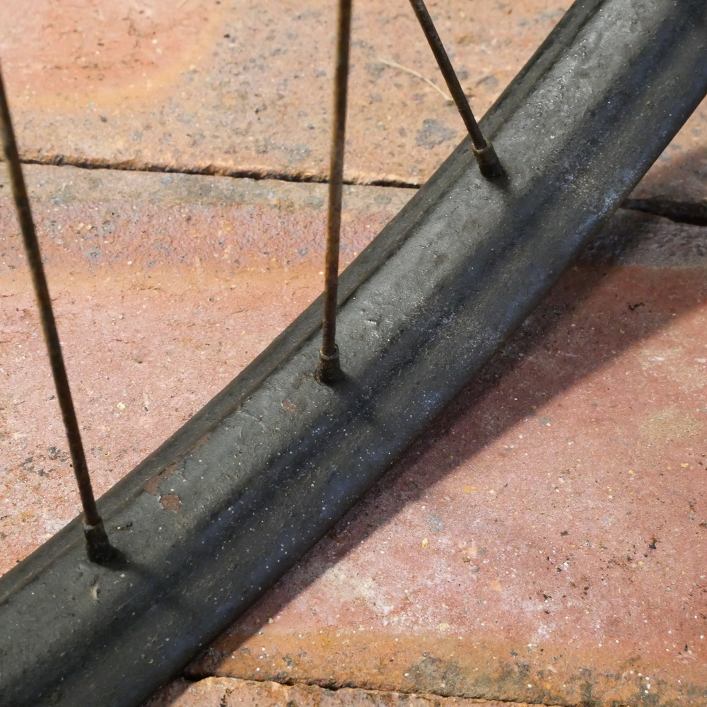 Vorderrad 28 x 1,75 (622), Stahlfelge für Drahtbereifung, 1950er/60er Jahre, schwarz überstrichen, gebr.