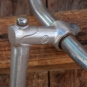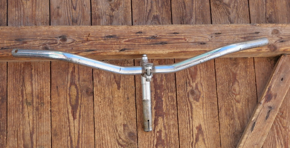 Fahrradlenker, original 50er/60er Jahre, Lenkerbügel verchromt, Vorbau BF Alu, für Sportrad, Durchmesser Lenkrohr und Schaft 22,2 mm, Breite ca. 620 mm, Schaftlänge 140 mm, gebraucht mit Patina, Zustand siehe Bilder.