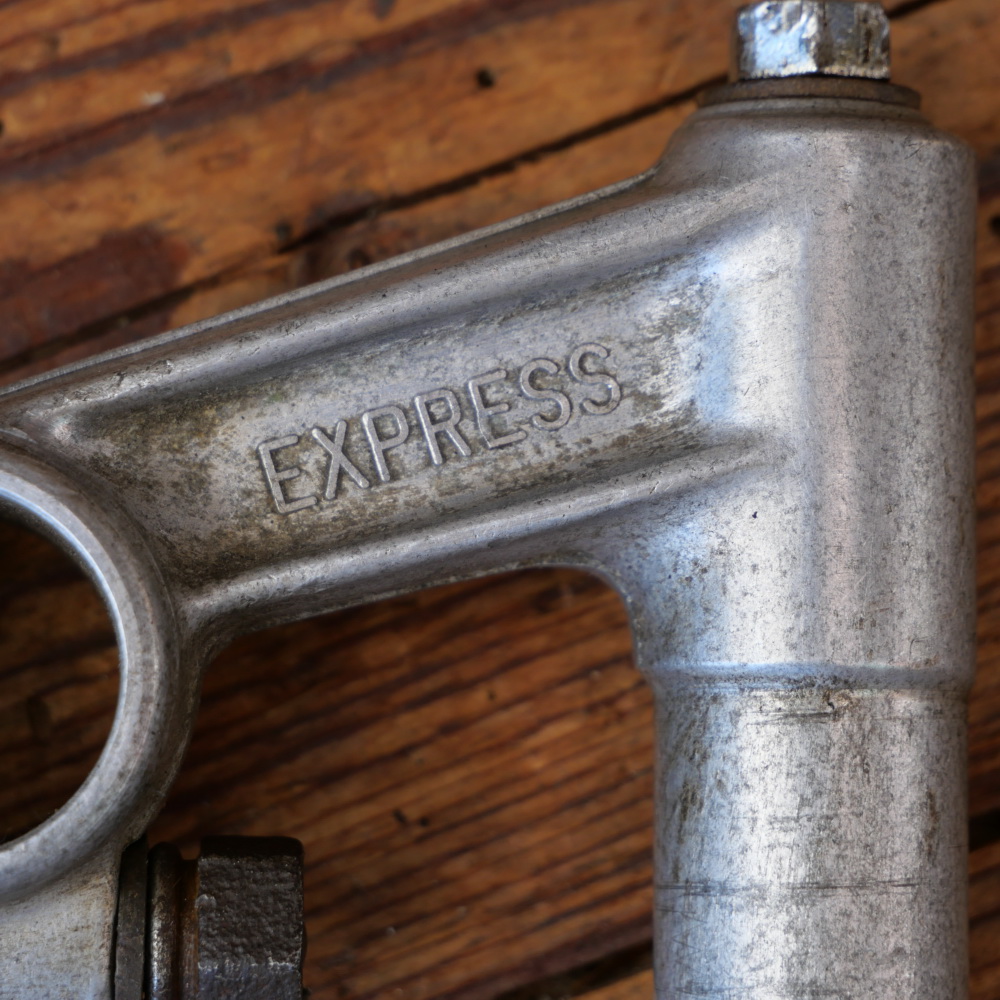 Vorbau Fahrrad EXPRESS, original 50er Jahre, für Sport-/Rennrad, Alu, Länge 75 mm, Schafthöhe ca. 150 mm, Durchmesser Klemmung 25 mm, gebraucht mit Patina, Zustand gemäß Fotos.