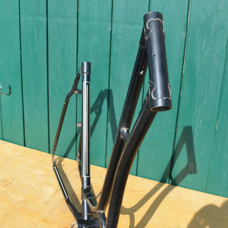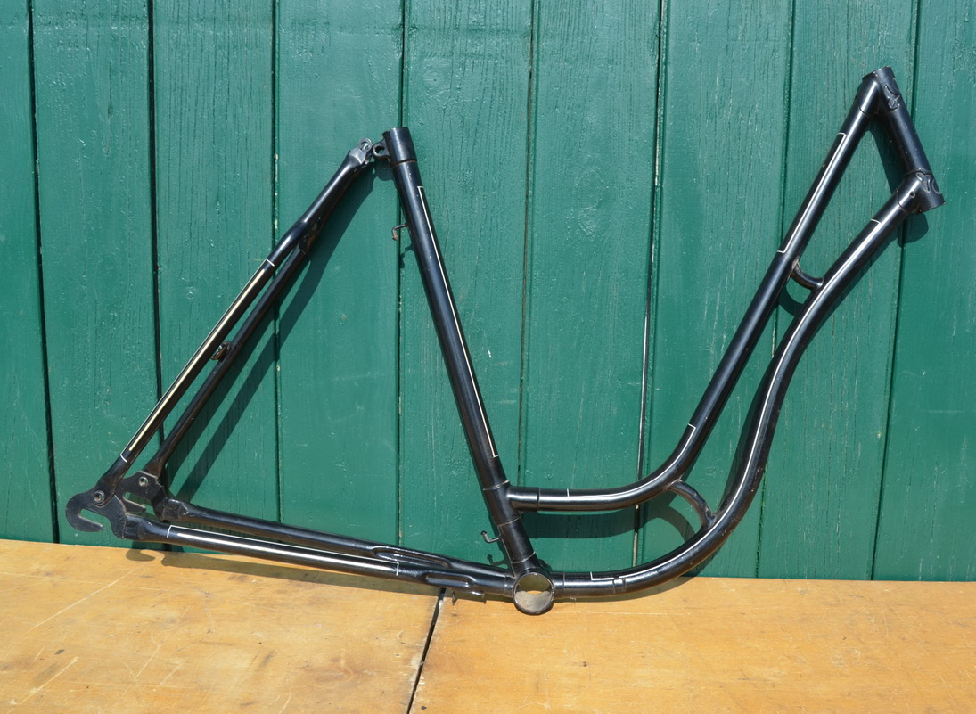 Fahrradrahmen Fabrikant unbekannt, Damenausführung, 28 Zoll, Linierung gold/weiß, 50er Jahre, Rahmenhöhe 54 cm, Rahmennummer 430XXX. Dieser Rahmen wurde von Jahrzehnten abgestrahlt, neu lackiert, handliniert aber nie aufgebaut. Ein paar lagerungsbedingte, kleine Kratzer können vorhanden sein. Ansonsten aber eine unschlagbar günstige Möglichkeit, einen bereits aufgearbeiteten, frühen Rahmen zu neuem Leben zu erwecken!