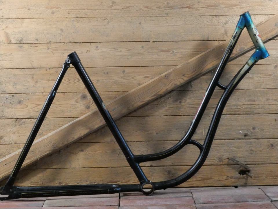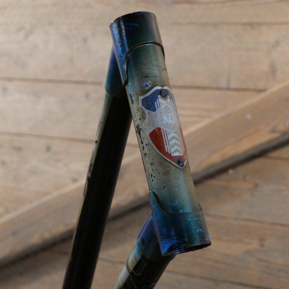 Fahrradrahmen Record, Damenausführung, 28 Zoll, 1950er J., Originallack schwarz, Strahlenkopf weiß/blau, Goldlinien, Rahmenhöhe 54 cm, Rahmennummer 40XXX, ohne Gabel! Steuerrohr: Durchmesser für 1 Zoll, Höhe 170mm, Tretlagermuffe: Durchmesser 40mm, Breite 70mm, gebraucht mit schöner Patina, Zustand gut, siehe Fotos