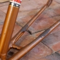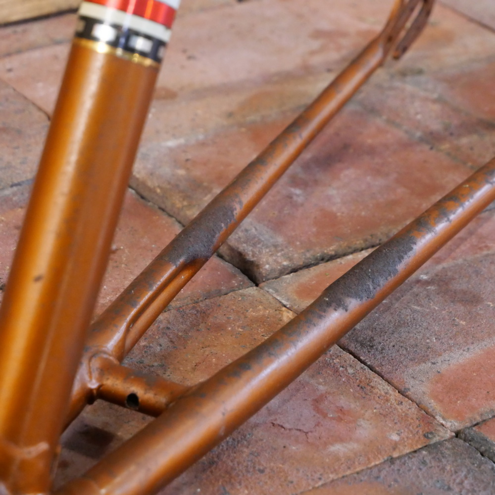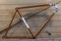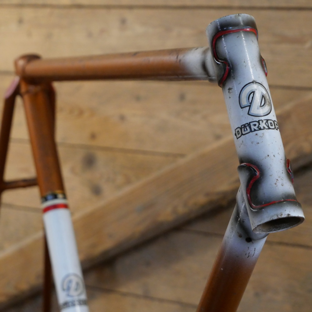 Fahrradrahmen DÜRKOPP, 26 Zoll, Herrenausführung für Sportrad, Ende 50er J., orangebraun-metallic/ schwarz/weiß, Rahmenhöhe 55 cm, Oberrohr 58 cm, Einbaubreite ca. 106 mm, Rahmennummer 2132XXX, Tretlager BSA 66/34 mm, OHNE Gabel! Steuerkopf 150 mm, alte Neuware mit Patina, Zustand gemäß Fotos