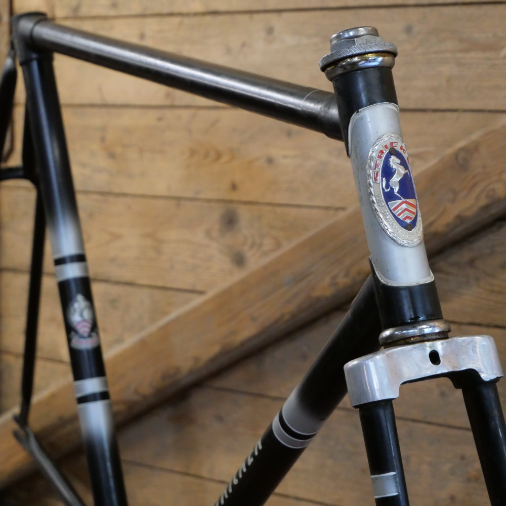 Fahrradrahmen STRICKER, 26 Zoll, Herrenausführung für Tourenrad, 50er J., schwarz/silber, Linien weiß, Rahmenhöhe 54,5 cm, Oberrohr 61,5 cm, Einbaubreite ca. 113 mm, Rahmennummer 903XXX, Tretlager 70/40 mm, Steuerlager gut, alte Neuware mit schöner Patina, Zustand gemäß Fotos