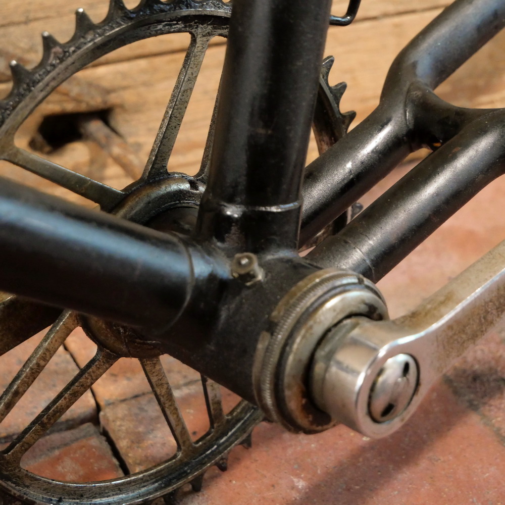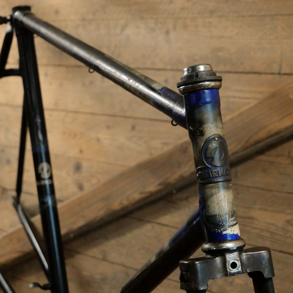Fahrradrahmen DÜRKOPP, Herren, für Tourenrad, 28 Zoll, Stahl, 50er J., schwarz, Strahlenkopf blau/weiß geflammt, Linien gold, Rahmenhöhe 56 cm, Einbaumaß 114 mm, mit Glocken-Lager, Kettenblatt 46 Zähne, Rahmennummer 2194XXX, gebraucht mit Patina, Tretlager gut, Steuerlager überholungsbedürftig, Zustand gemäß Fotos