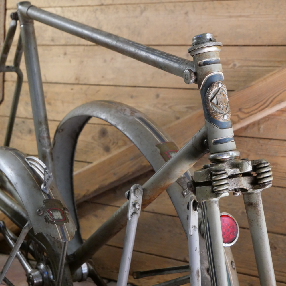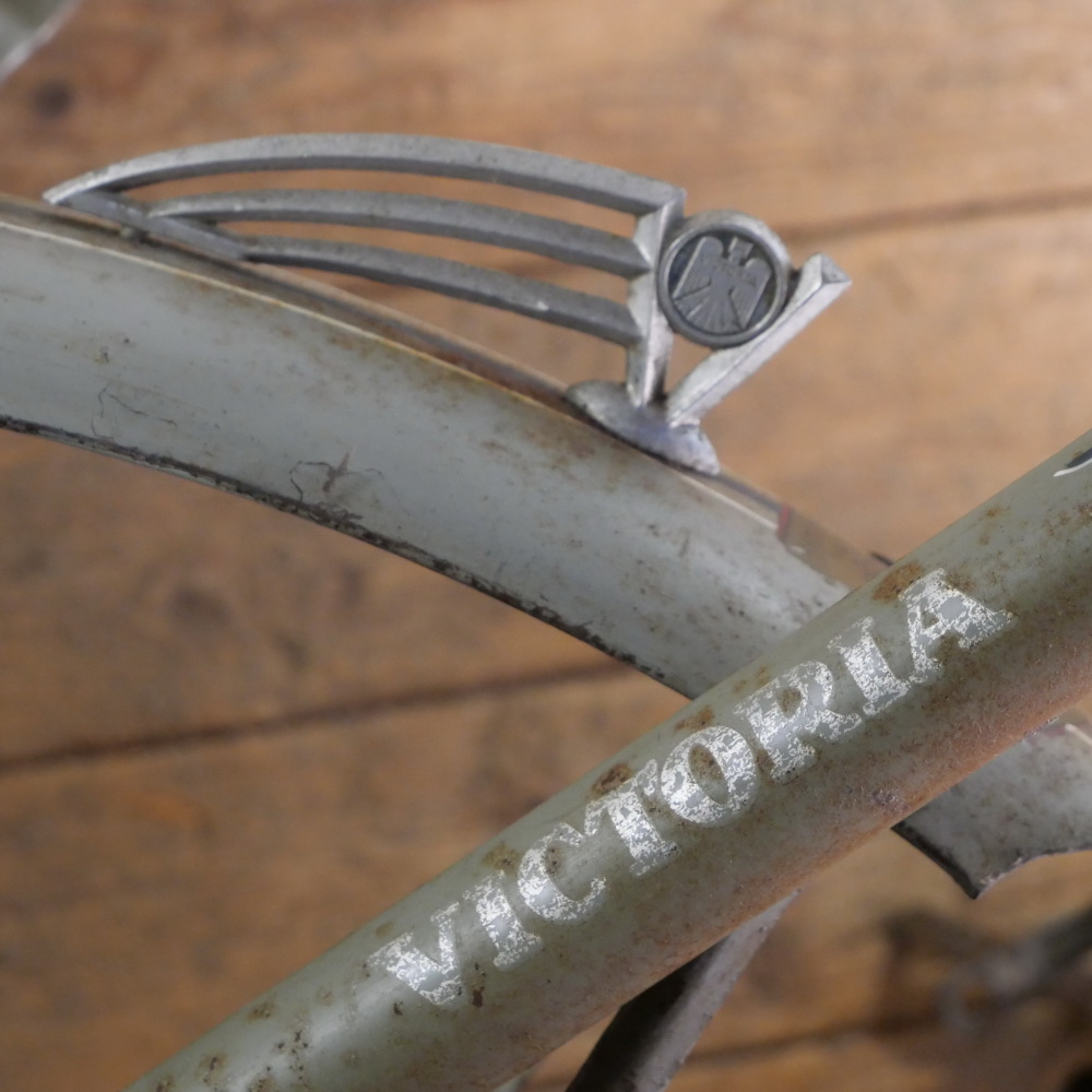 VICTORIA Fahrgestell für Hilfsmotor, 40er/50er J., passend für FM 38 und FM 38L, mit Federgabel, 26 Zoll Ballon, graugrün, Strahlenkopf blau/weiß, Rahmenhöhe 55 cm, Einbaubreite ca. 110 mm, Rahmennummer: 1642XXX, Kettenblatt 46 Zähne, inkl. originalen Schutzblechen, Ständer und Kettenschutz, gebraucht mit Patina, Zustand gemäß Fotos