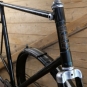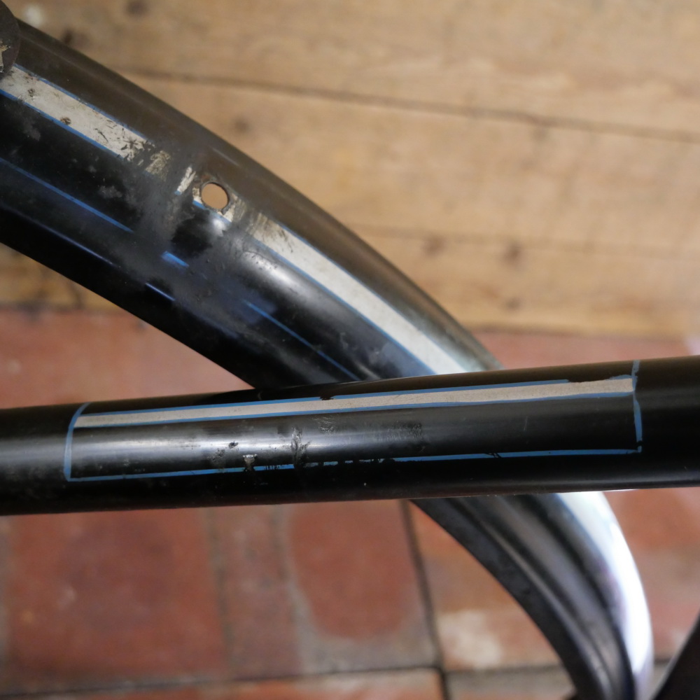 Fahrradrahmen TRAVE/Lübeck (PRESTO-Fabrikat), für Tourenrad, Herren, 30er J., 28 Zoll, Stahl, schwarz, Linien blau/silber, Rahmenhöhe 61 cm, Einbaumaß 107 mm, Glockenlager, Kettenblatt 46 Zähne, Rahmen-Nr. 622XXX, inkl. Originalschutzbleche, gebraucht mit schöner Patina, Lager o.k., Zustand gemäß Fotos
