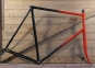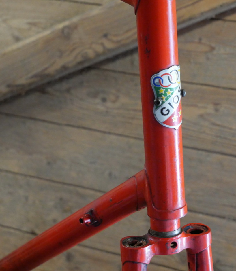 Fahrradrahmen GIOS, für Profi-Rennrad 27/28 Zoll, Stahl, Ende 70er/Anf. 80er J., ältere Neulackierung rot/schwarz, sehr hochwertig gefertigt mit COLUMBUS Rohrsatz und CAMPAGNOLO Ausfallenden, Rahmenhöhe 65 cm, Oberrohrlänge 59 cm, Einbaumaß 128 mm, Innenlager Ital 70/35 mm, Rahmen-Nr. 23XXX, Gabelplättchen fehlen, Steuerkopfschild nachträglich verschraubt, gebraucht mit Patina, Zustand gemäß Fotos