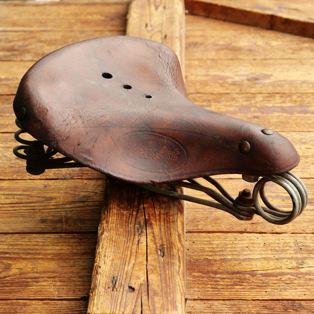 Sattel STADION Mod. Tourist, für Herrenrad, Leder, braun, Gestell kadmiert, Tschecheslowakei 50er/60er J., Länge ca. 28 cm, Breite ca. 22 cm, gebraucht mit Patina, Zustand gemäß Bildern