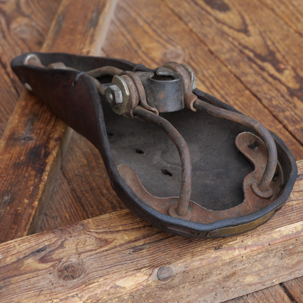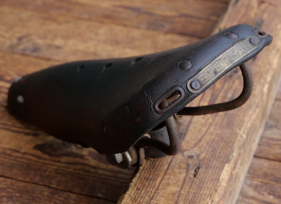 Sattel STEPHAN/Mühlhausen, für Rennrad, Leder, braun, Gestell ursprünglich vernickelt, original 20er Jahre, Länge ca. 33 cm, Breite ca. 17 cm, Nieten vorn aus Aluminium, gebraucht mit Patina, Zustand gemäß Bildern