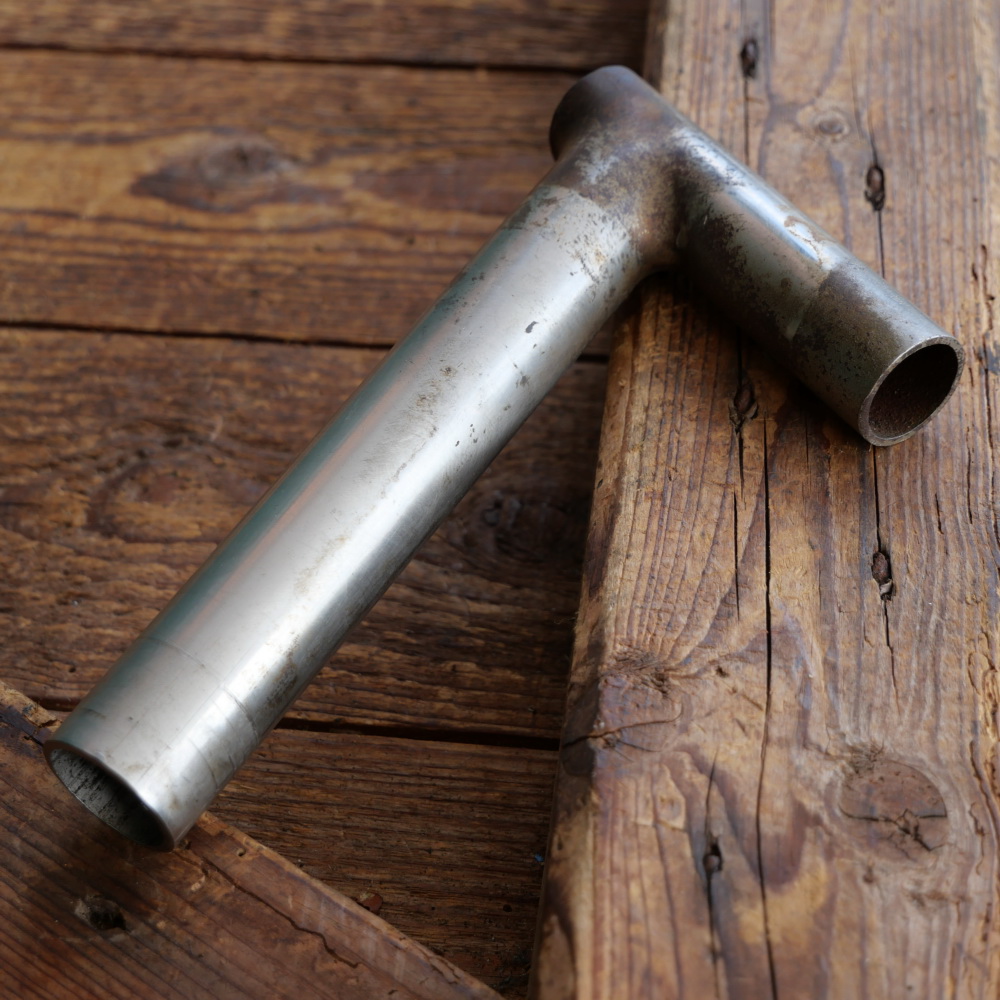 Winkelsattelstütze, Durchmesser: ca. 26,0 mm, Schaftlänge: ca 135 mm, vernickelt, orig. 10er-30er Jahre, gebraucht mit Patina, Zustand siehe Foto.