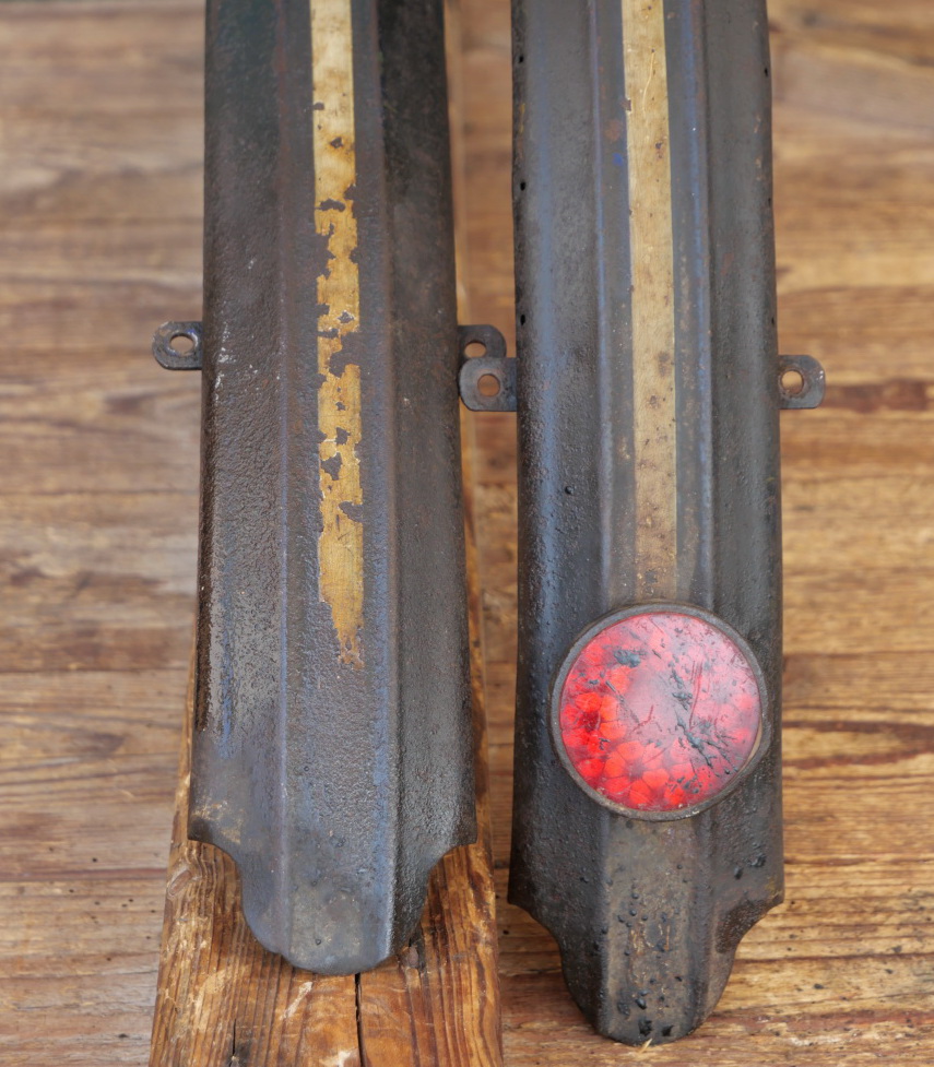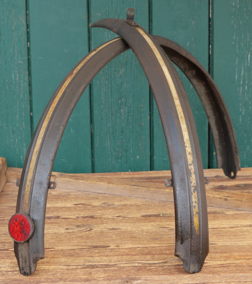 Schutzbleche Satz, 28 Zoll, schwere Damenausführung für Tourenrad, 30er J., schwarz, Mitte weiß, Breite ca. 60 mm, gebraucht, Originallack, Zustand gemäß Fotos.