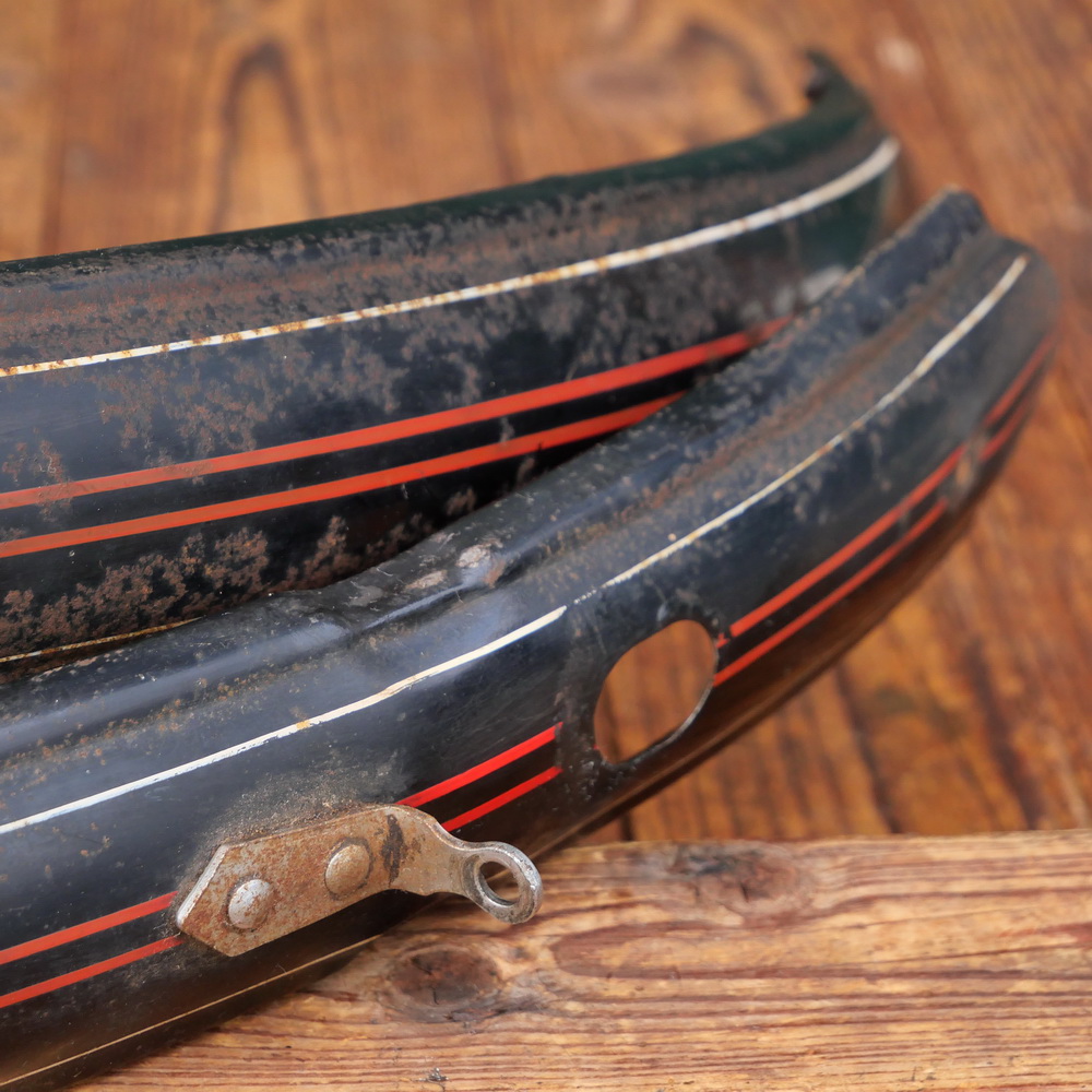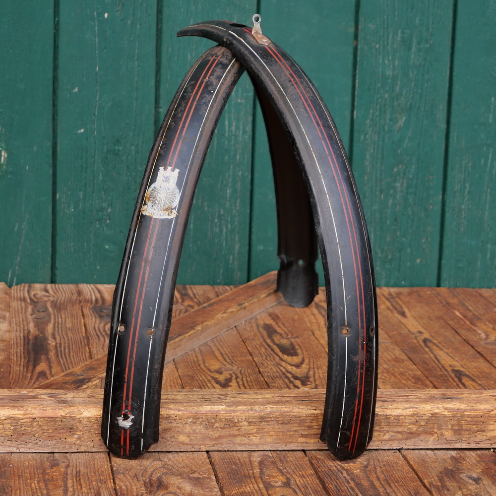 Schutzbleche Satz GÖRICKE, 28 Zoll, Damenausführung, 30er J., schwarz, Linien rot/weiß, Breite ca. 60 mm, gebraucht mit Patina, Zustand gemäß Fotos.