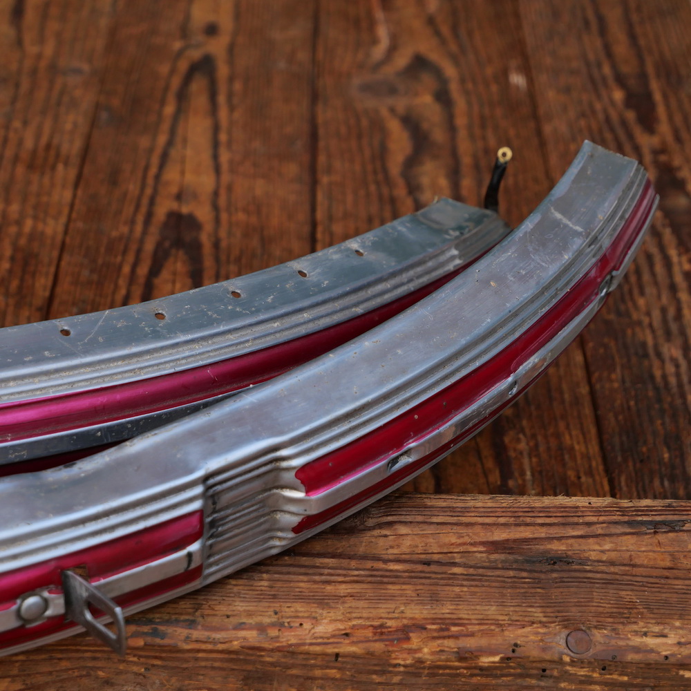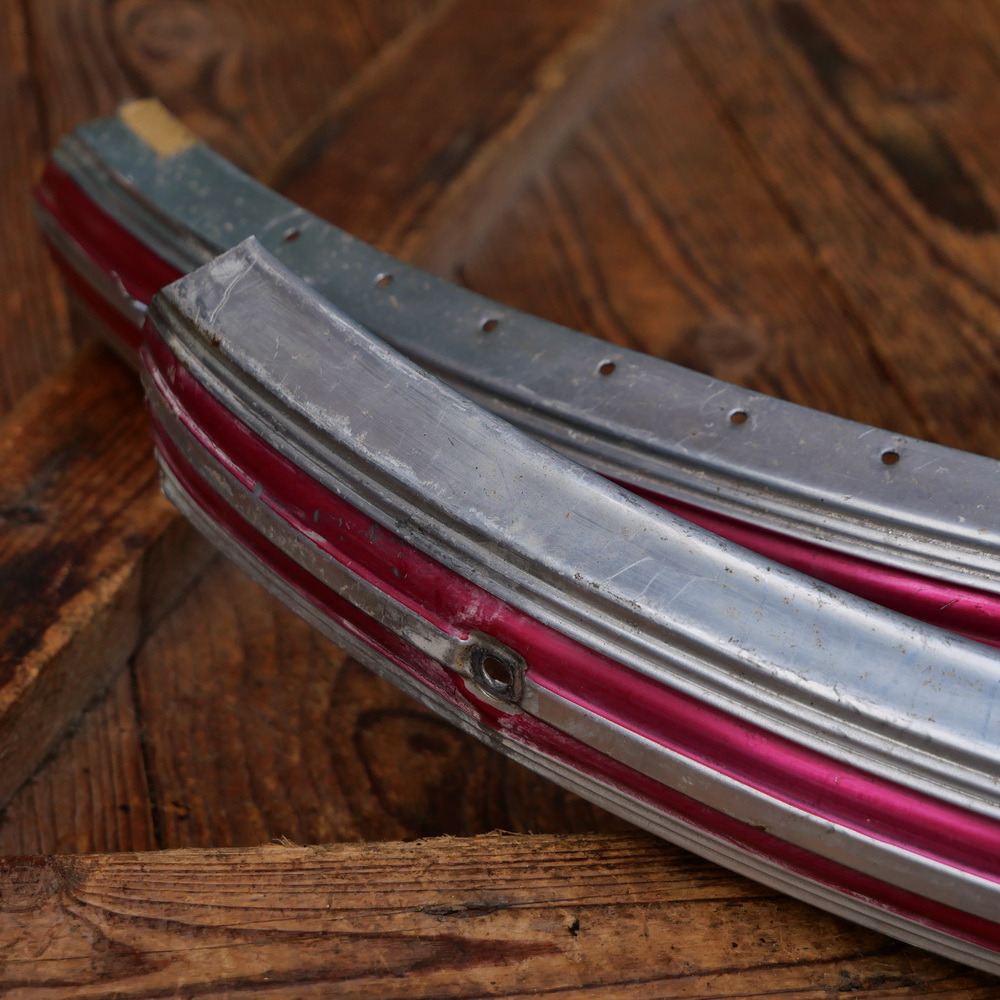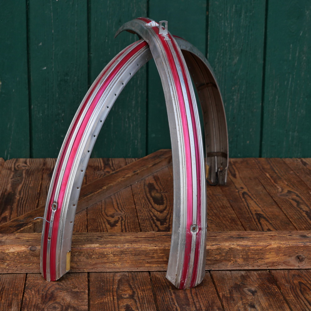 Schutzbleche Satz NSU, 26 Zoll, Damenausführung, 60er/70er J., Feran, Linien rot-metallic, Breite ca. 56 mm, gebraucht mit schöner Patina, Zustand gemäß Fotos.