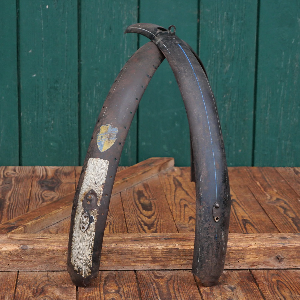 Schutzbleche Satz STANBERG, 26 Zoll, Damenausführung für Ballonrad, 30er J., schwarz, Linien blau/weiß, Breite ca. 61 mm, gebraucht, Zustand gemäß Fotos.