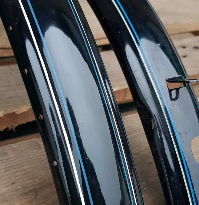 Schutzblechsatz 28" Damenausführung, rare alte Neuware (s. Bilder) , schwarz 28 x 1,75, ca. 60 mm breit, orig. 30-50er Jahre, liniert blau-weiß. Liechte, lagerungsbedingte Patina ist partiell möglich.