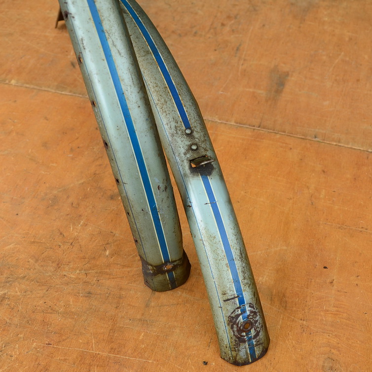 Schutzblechsatz "Buschkamp" 28 Zoll, silber, Linierung blau/weiß, Damenausführung, Breite ca. 44 mm, 50er Jahre
