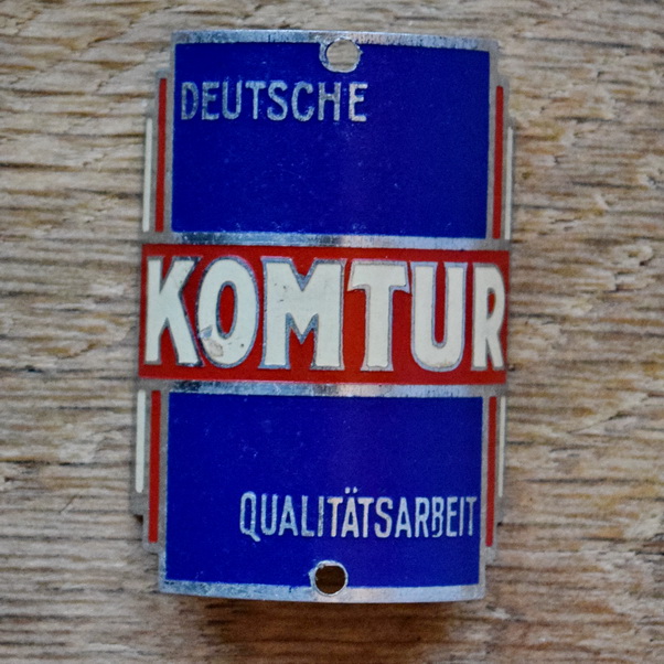 Steuerkopfschild KOMTUR, 50er Jahre, Originalschild aus Sammlungsbestand, Lochabstand 45 mm Ideal für den passenden Fahrradoldtimer oder die Sammlervitrine. Zustand siehe Bild. Übrigens: Wir haben noch eine Riesenmenge weiterer Steuerkopfschilder und Schutzblechembleme im Bestand, die wir niemals alle listen können. Fragt einfach an, wenn Ihr auf der Suche nach einem speziellen Schild oder Emblem seid, vielleicht können wir helfen.