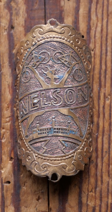 Steuerkopfschild NELSON/Berlin, 20er/30er Jahre, Originalschild aus Sammlungsbestand, Lochabstand 69 mm Ideal für den passenden Fahrradoldtimer oder die Sammlervitrine. Zustand siehe Bild. Übrigens: Wir haben noch eine Riesenmenge weiterer Steuerkopfschilder und Schutzblechembleme im Bestand, die wir niemals alle listen können. Fragt einfach an, wenn Ihr auf der Suche nach einem speziellen Schild oder Emblem seid, vielleicht können wir helfen.