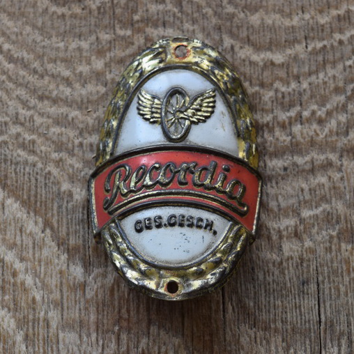 Steuerkopfschild Steuerkopfschild Recordia, 50er Jahre, Originalschild aus Sammlungsbestand, Lochabstand 55 mm Ideal für den passenden Fahrradoldtimer oder die Sammlervitrine. Zustand siehe Bild. Übrigens: Wir haben noch eine Riesenmenge weiterer Steuerkopfschilder und Schutzblechembleme im Bestand, die wir niemals alle listen können. Fragt einfach an, wenn Ihr auf der Suche nach einem speziellen Schild oder Emblem seid, vielleicht können wir helfen.