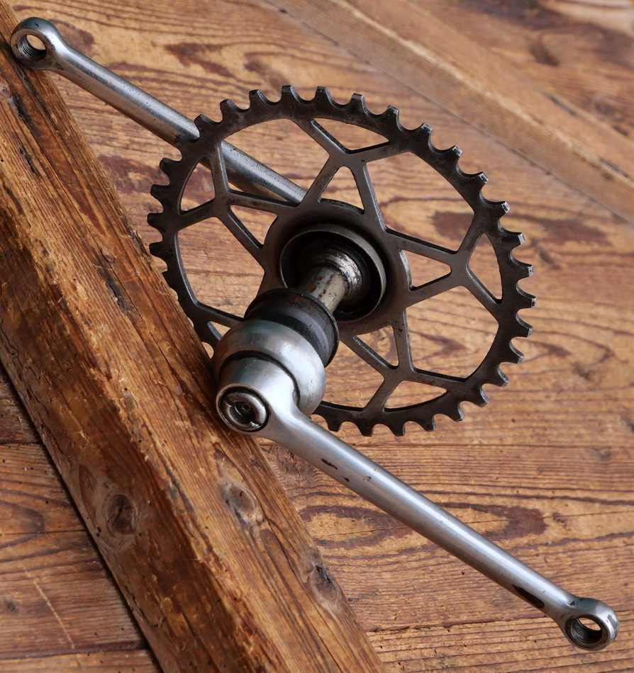 Tretlager für Tourenrad, orig. 30er J., verchromt, Glockenlager, 5/8 Zollteilung, Kettenblatt 36 Zähne, Kurbellänge 170 mm, inkl. komplettem Lager, Schalendurchmesser 40mm, gebraucht mit schöner Patina, Lager gut, Zustand siehe Bilder.