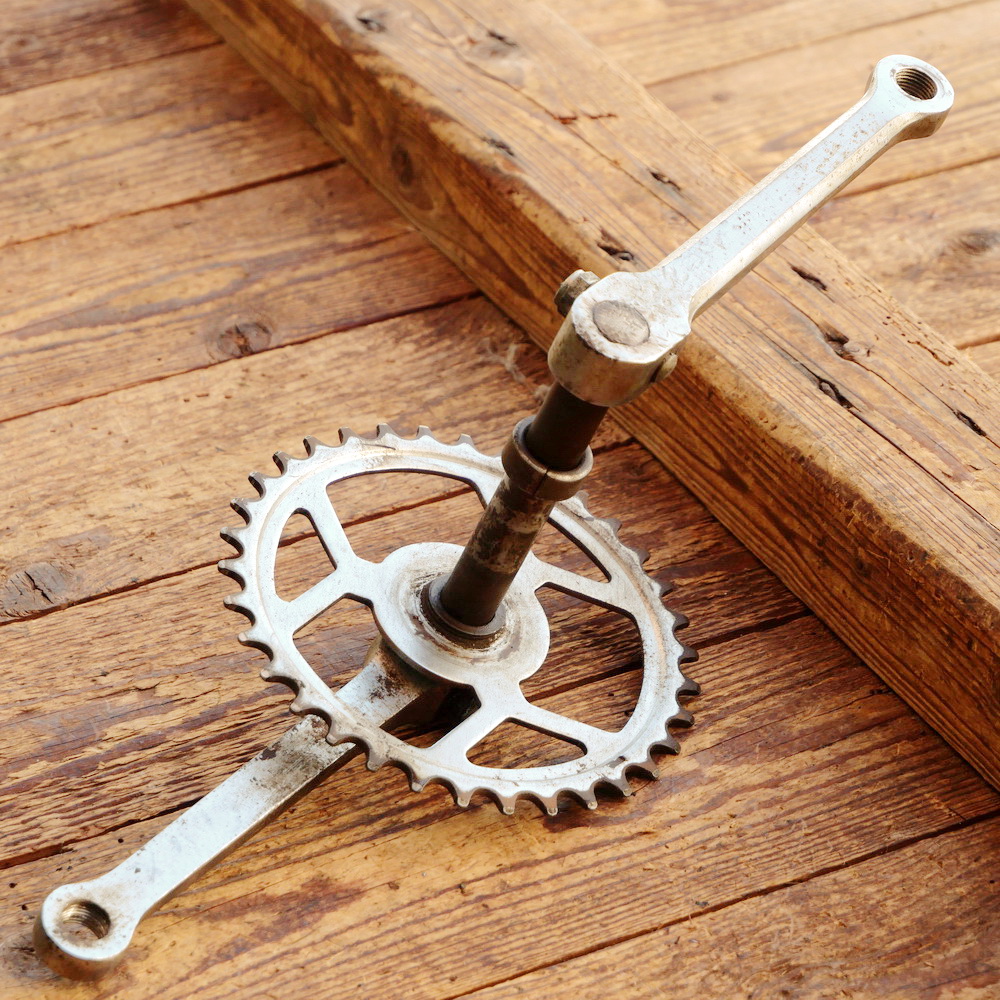 Tretlager für VELOSOLEX, orig. um 1970, verchromt, Gleitlager, Kettenblatt 34 Zähne, Kurbellänge 150 mm, Achsdurchmesser 17 mm, Achslänge 84 mm, gebraucht, Zustand siehe Bilder.