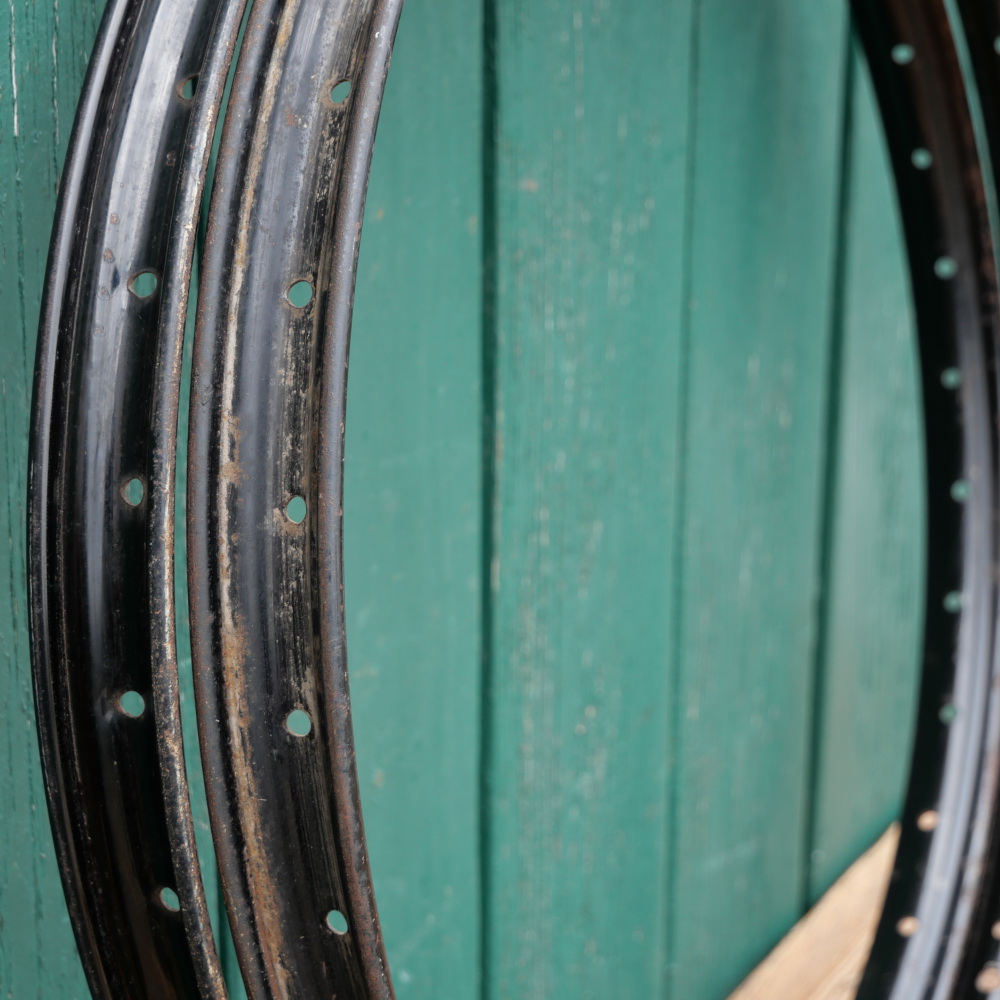 Mopedfelgen-Satz 26 x 2.00/2-22, 30er - 50er J., Westwood, Stahl, schwarz, Breite 40 mm, 36 Loch, Bohrungen 6 mm, für Motorfahrräder 74/98 ccm , alte Neuware mit partieller Lagerpatina, Zustand gemäß Fotos.
