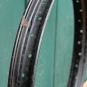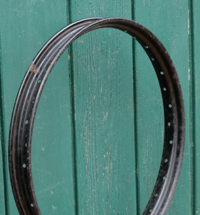Transportrad-/Anhängerfelge, 20 Zoll, 30er-60er J., Stahl, schwarz, Breite 46 mm, 36 Loch, Bohrungen 6 mm, alte Neuware mit Lagerpatina, Zustand gemäß Fotos.