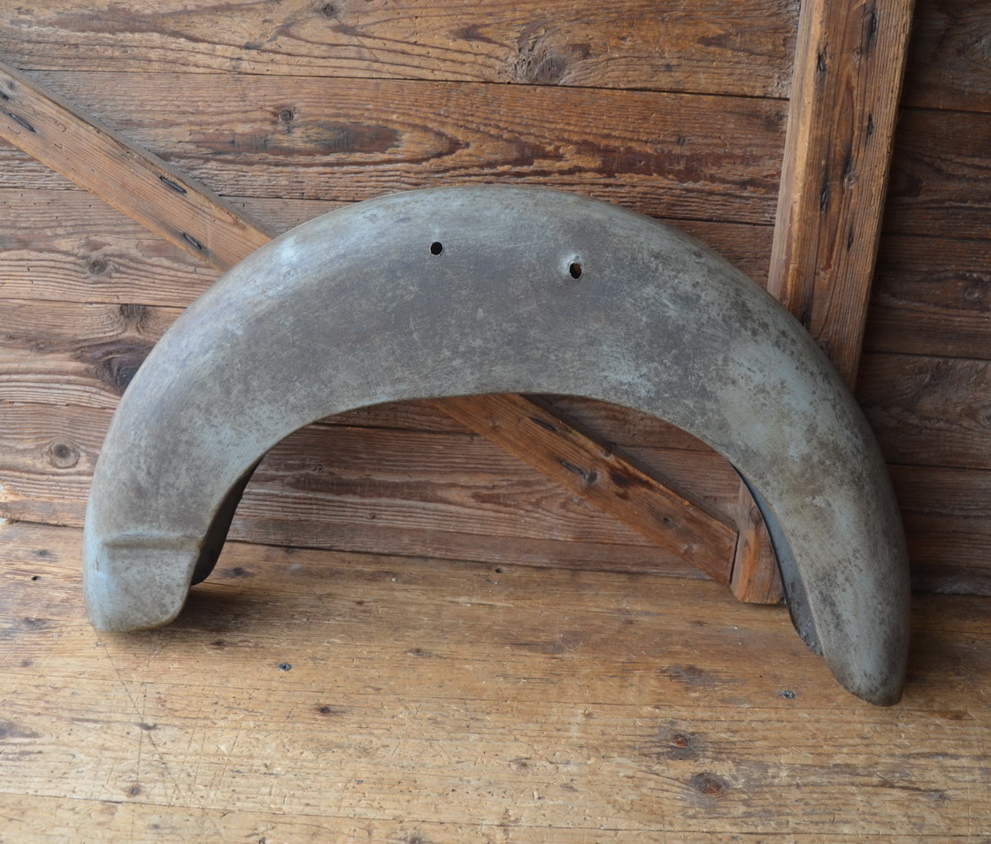 Moped-Schutzblech hinten, Weite unten ca. 700 mm, Höhe ca. 390 mm, Breite ca. 100 mm. Alte Neuware mit Patina aus "Rixe" Werksnachlass