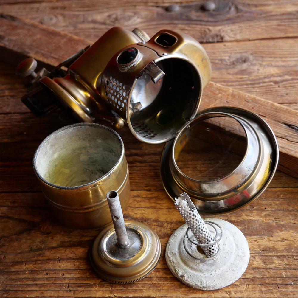 Karbidlaterne "Powell & Hammer", 1920er-30er J., Messing, Höhe ca. 18cm, Durchmesser ca. 10cm, gebr.