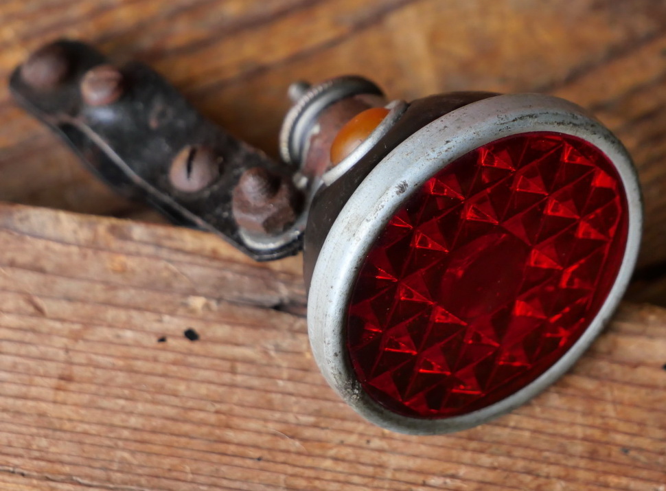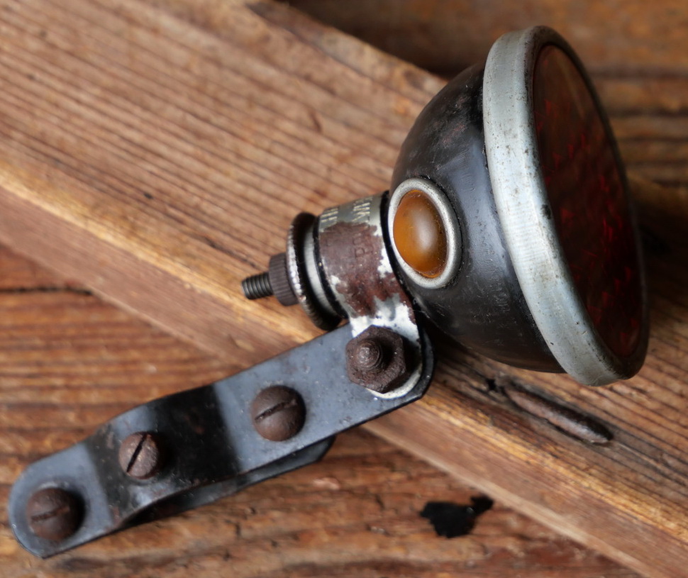 Streben-Rücklicht "AHA", orig. 30er Jahre, Luxusmodell mit 2 Kontrollaugen und Echtglaseinsatz, rare unbenutzte Ware mit schöner, lagerungsbedingter Patina. Hier die seltene Gelegenheit eines der wenigen verbliebenen Exemplare aus altem Lagerbestand zu erwerben.