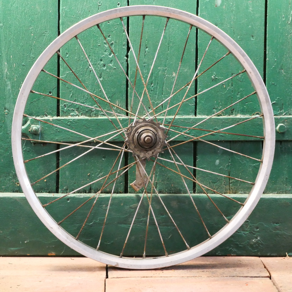 Hinterrad 20 Zoll (407), DDR 1987, für Klapprad, Alu poliert, Breite ca. 28mm, 2mm Speichen verchromt, RENAK-Nabe verchromt mit Steckritzel 16 Zähne und Bremsklaue 22mm, Einbaumaß ca. 109mm, gebraucht, Zustand gemäß Fotos