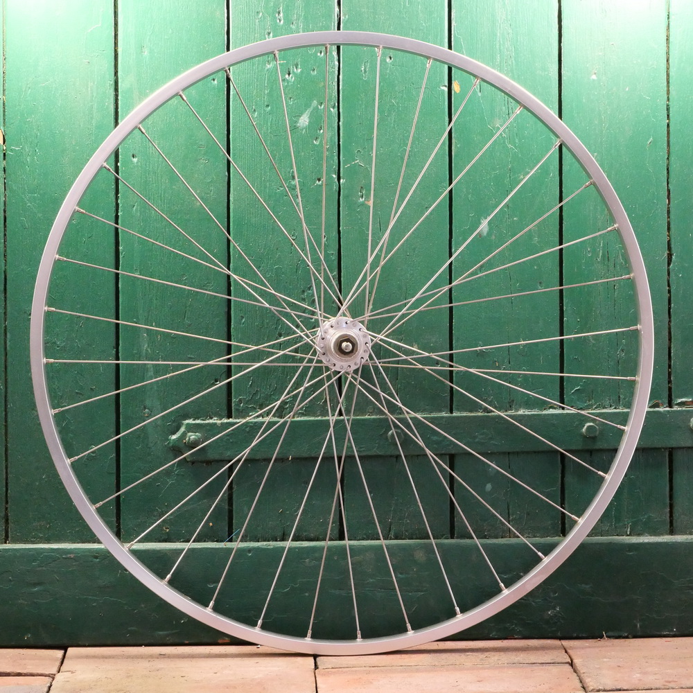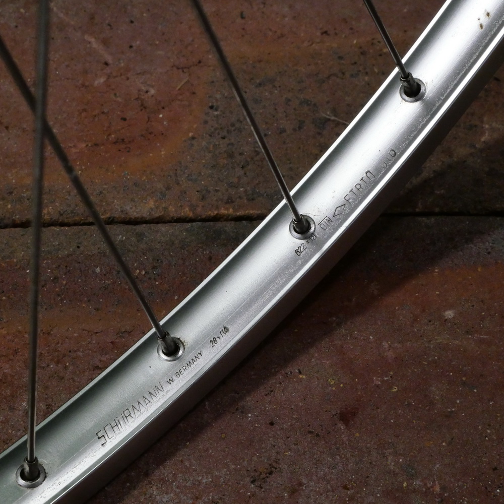 Hinterrad 28 Zoll (622), 1986, SCHÜRMANN Alu-Felge für Drahtreifen, Breite ca. 23mm, 2mm Niro-Speichen, MAILLARD Helicomatic-Nabe, Einbaumaß ca. 127mm, alte Neuware mit minimaler Patina, Zustand gemäß Fotos