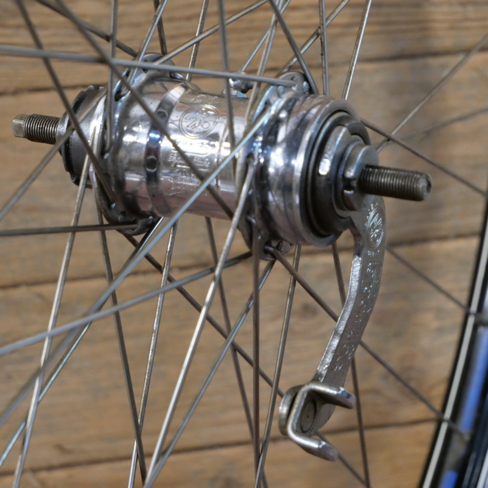 Hinterrad, 28 Zoll (622), 50er/60er J., Felge schwarz, Linien blau/weiß, Breite ca. 36 mm, Nabe F&S Torpedo 1963 für Steckritzel mit Bremsklaue 14 mm, Einbaumaß ca. 108 mm, 2mm Speichen nirosta, gebraucht mit schöner Patina, Zustand gemäß Fotos
