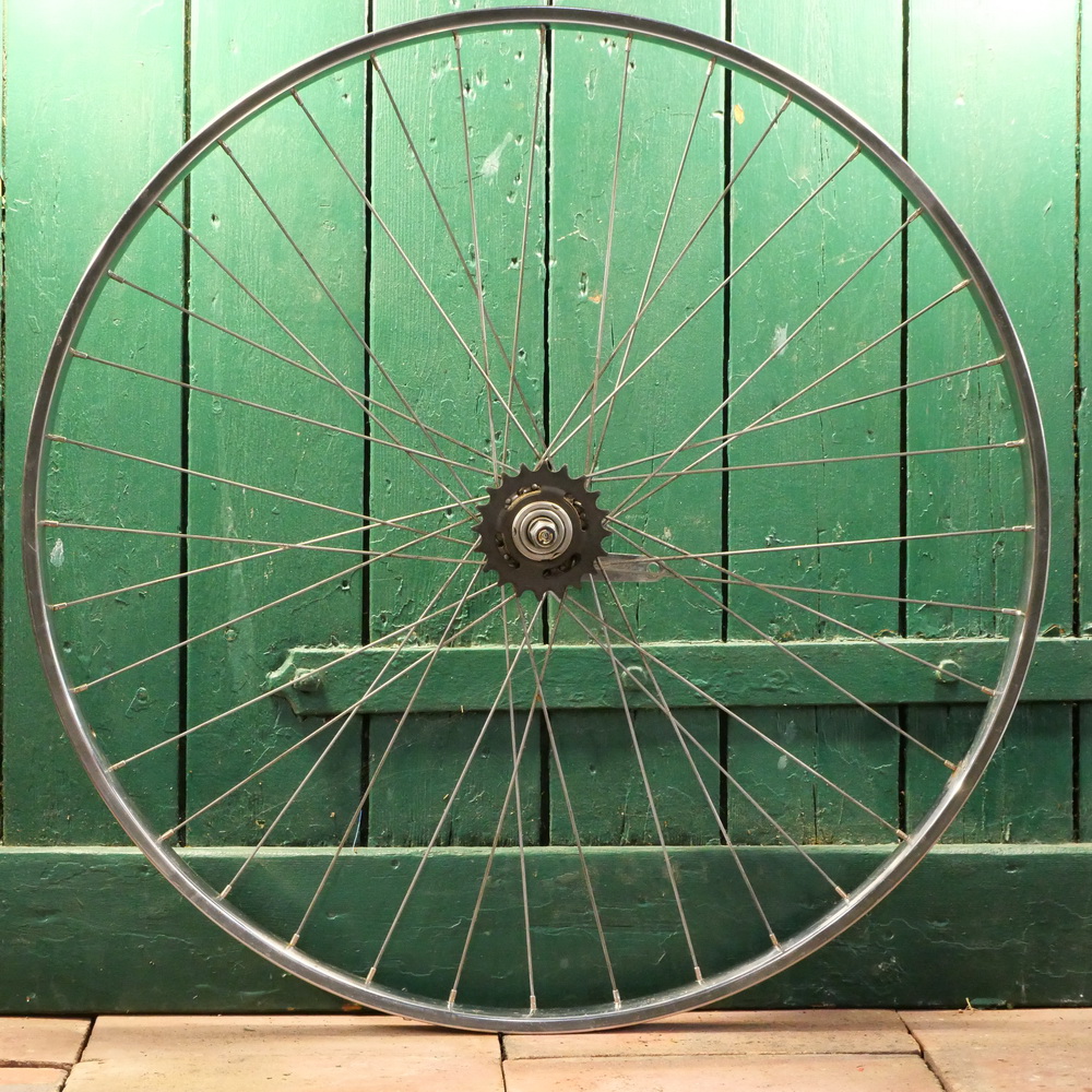 Hinterrad 28 Zoll (622), 70er/80er J., VAN SCHOTHORST-Felge für Drahtreifen, Stahl verchromt, Breite ca. 28mm, 2mm Speichen verzinkt, FAVORIT-Nabe verchromt mit Steckritzel 20 Zähne, Einbaumaß ca. 107mm, gebraucht, Zustand gemäß Fotos