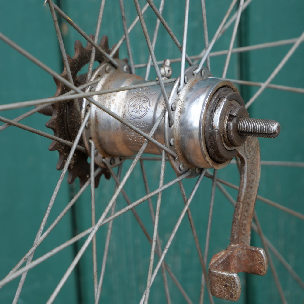 Hinterrad 28 Zoll (622) Drahtbereifung, Felge 20er/30er J., Holzdekor, Linien schwarz, Breite ca.35 mm, F&S Torpedo-Nabe, verchromt, Bj. 1961, Einbaumaße: ca. 108 mm, mit Schraubkranz 20 Zähne, 2mm Speichen verzinkt, gebraucht mit schöner Patina, Lager und Funktion gut, Zustand gemäß Fotos