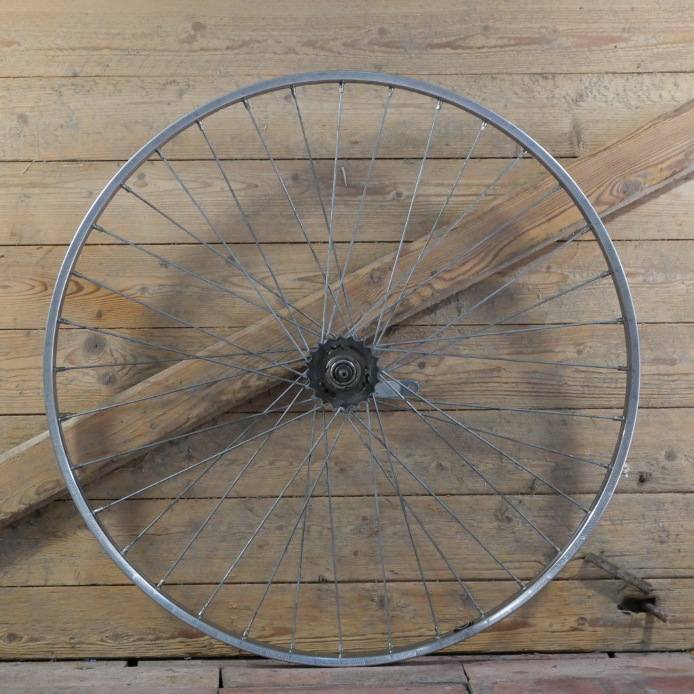 Hinterrad mit VAN SCHOTTHORST Niro-Felge 28 Zoll (622), 1980er/90er J., Breite ca. 29 mm, FAVORIT-Nabe mit Steckritzel 20 Zähne, Einbaumaß ca. 110 mm, 2,34mm Speichen verzinkt, gebraucht mit Patina, Zustand gemäß Fotos