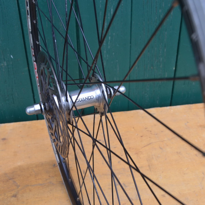 Laufrad vorn 28 Zoll mit Felge "MTB2X+Cross", 36-Loch, Felge schwarz mit schwarzen Speichen, Ventilbohrung 8,5 mm, Breite 23 mm, Hohlkammerprofil, Einbaumaß 100 mm, Nabe "Quando" mit Scheibenbremse