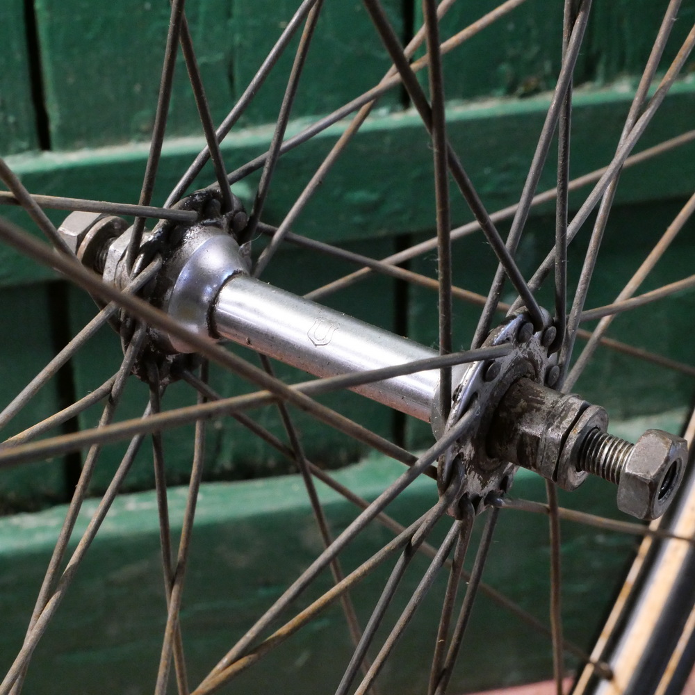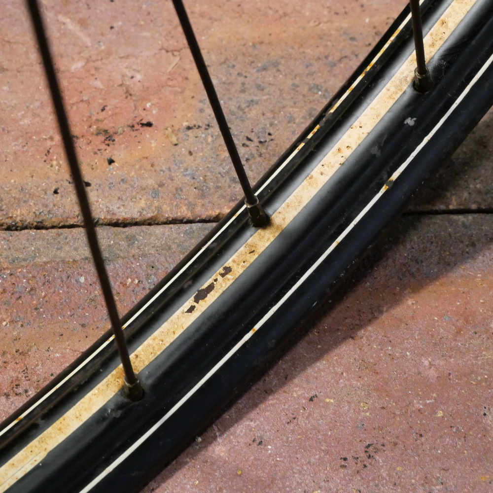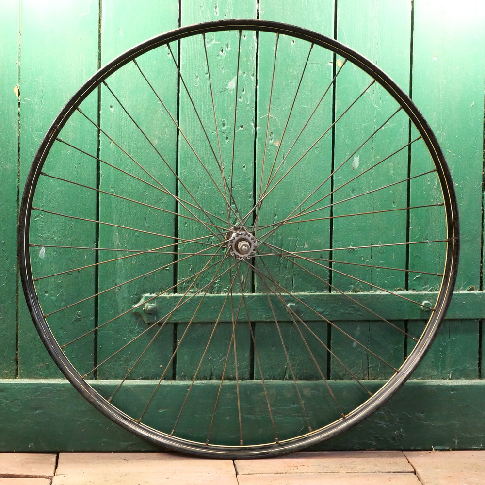 Laufrad vorn 28 x 1,75 für Drahtbereifung, schwarz, Linierung weiss/weiss, 1950er-60er J., gebr.
