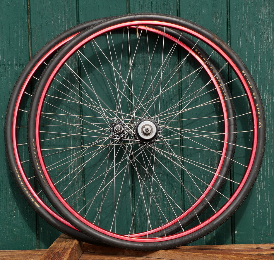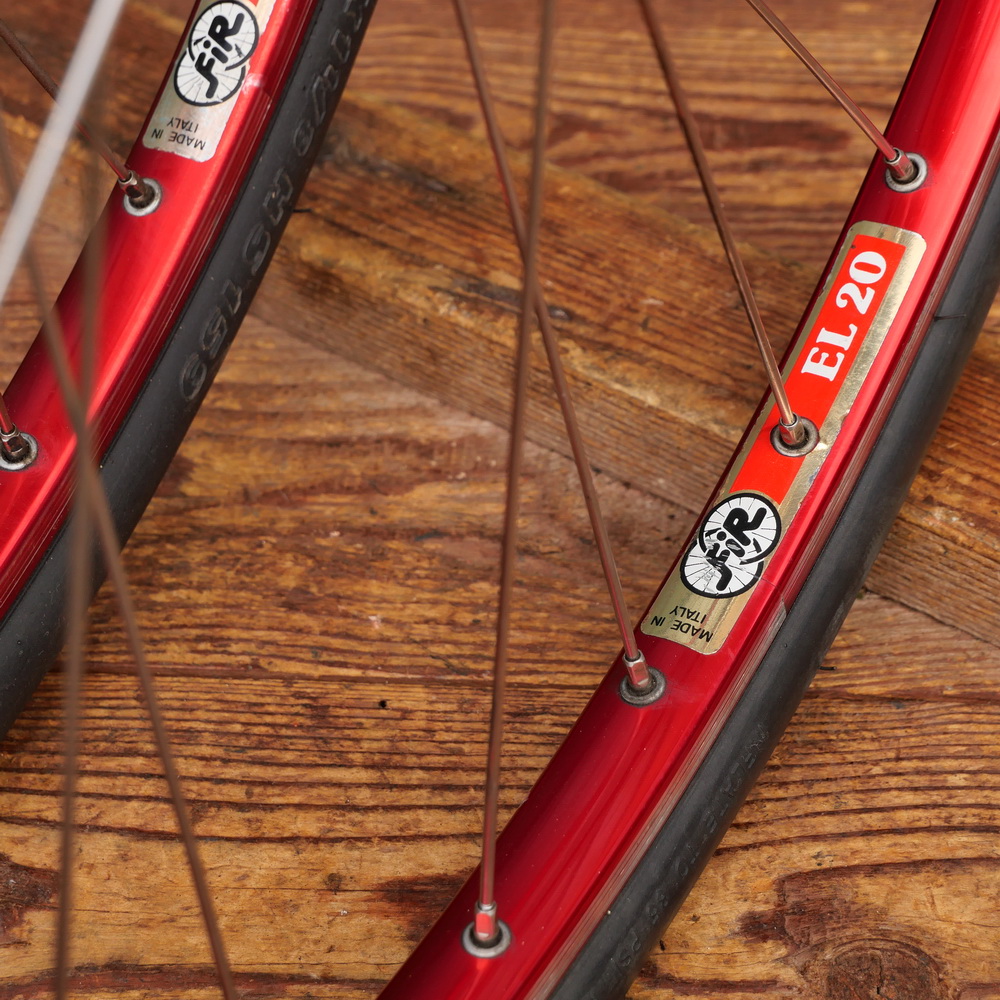 Laufradsatz 28 Zoll (622), 80er/90er J., F.I.R. EL20 Drahtreifenfelgen, Alu, rot-metallic, Naben: F&S Penta Sport, gebr.