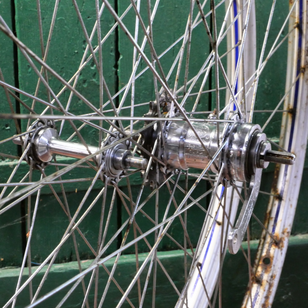 Laufradsatz 28 x 1,75 (622) für Drahtbereifung, Felgenbreite ca. 36 mm, silber, Linierung blau/weiß, Einbaumaß ca. 91/108, Naben: vorn F&S verchromt / hinten F&S Torpedo 1957, mit Schraubritzel 20 Zähne, deutliche Patina und Gebrauchsspuren, Lager sehr gut