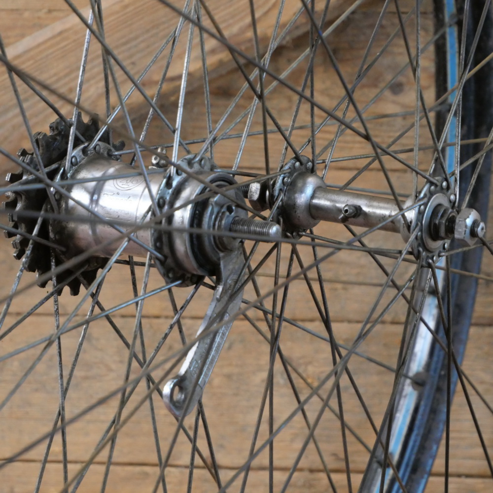 Laufradsatz 28 x 1,75 für Drahtbereifung, 50er J., Felgenbreite ca. 40 mm, schwarz, Linien blau/weiss, Einbaumaß ca. 91/108, Naben: vorn (verchromt)/F&S Torpedo (verchromt), mit 3-fach Schraubkranz 16/18/20 Zähne, Speichen 2mm vernickelt, Gebraucht mit Patina, Zustand gemäß Fotos