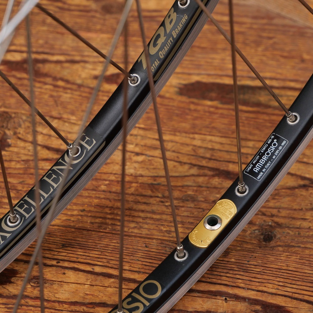 Laufradsatz für Drahtbereifung 28 Zoll (622), 90er J., für Rennrad, AMBROSIO Exellence-Felgen, Alu, Hohlkammer, Breite ca. 19mm, SHIMANO Exage-Naben mit 8-fach Kassette 13-26 Zähne, Einbaumaße ca. 130/100mm, 2mm Speichen Niro, gebraucht in gutem Zustand siehe Bildern