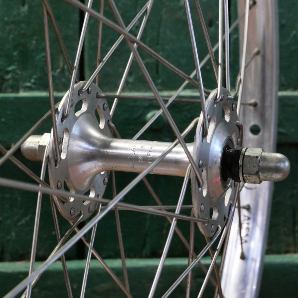 Vorderrad 22 x 1,75 Zoll (457), für Drahtbereifung, ALESA Alu-Felge, original 1988, Breite ca. 27 mm, Einbaumaß ca. 96 mm, MAILLARD Alu-Hochflanschnabe, Speichen 2 mm nirosta, alte Neuware mit minimalen Lagerungsspuren, Zustand gemäß Fotos