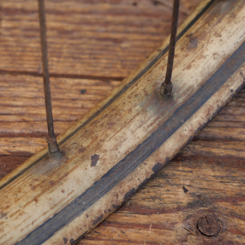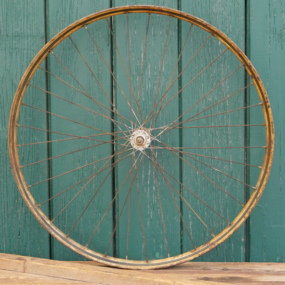 Vorderrad 26 Zoll (559) für Ballonbereifung, 30er J., Holzdekor, Linien schwarz/gold, Breite ca. 38 mm, Nabe verchromt, Einbaumaße: ca. 82 mm, 2mm Speichen verchromt, gebraucht mit Patina, Lager gut, Zustand gemäß Fotos