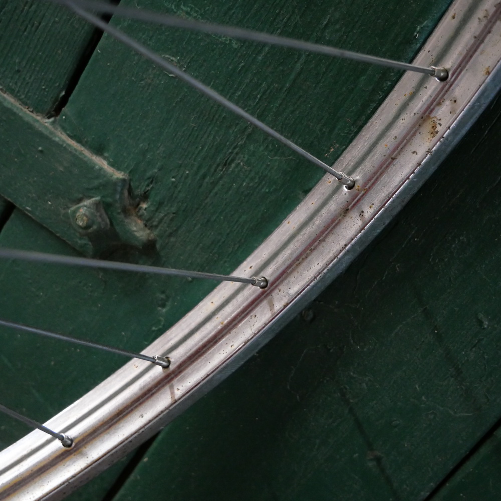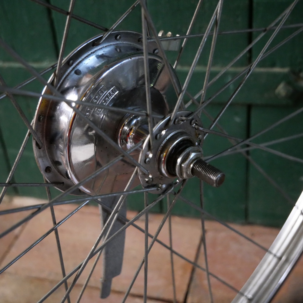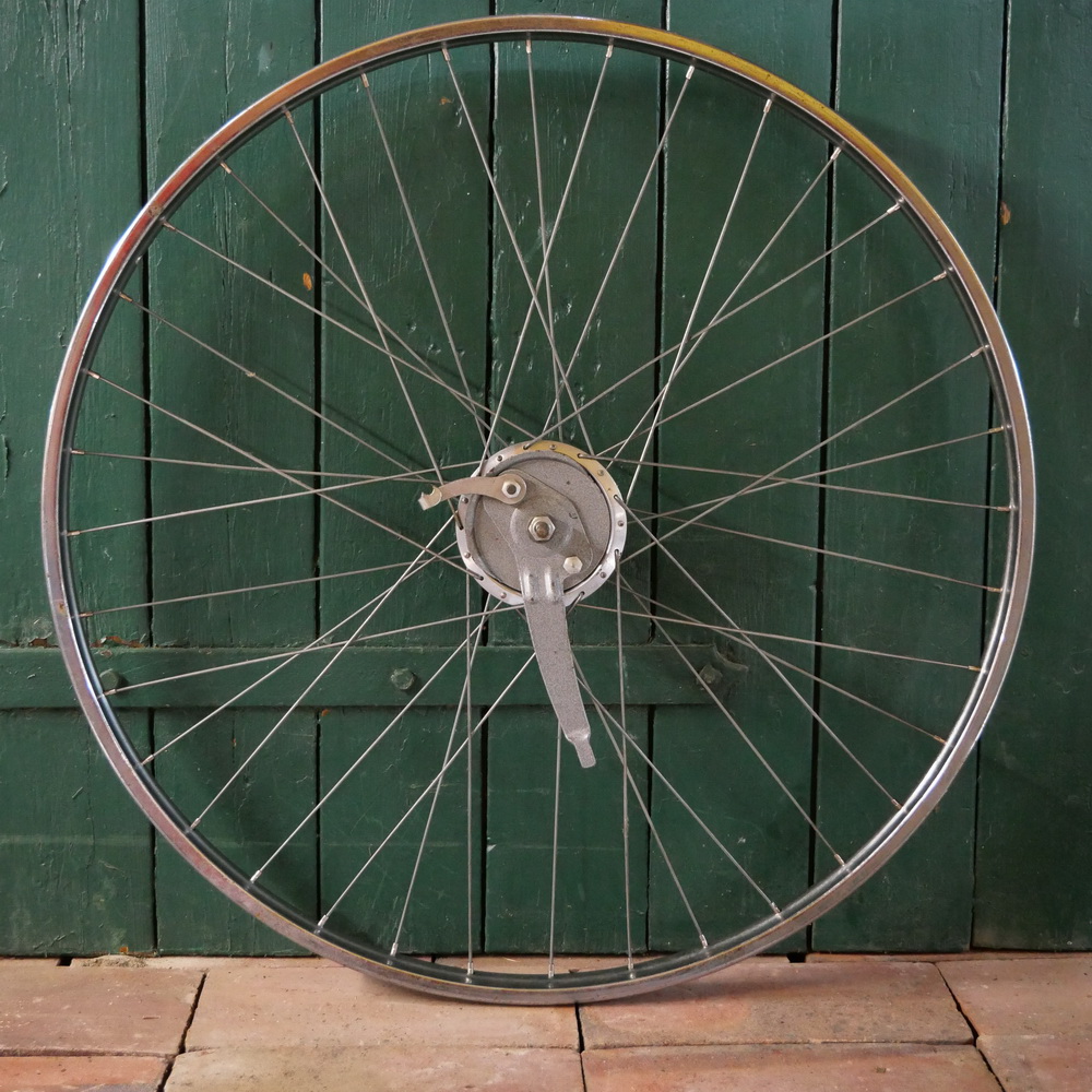 Vorderrad, Bj. 1983, 28 Zoll (635), für Tourenrad, Westwood Stahl-Felge verchromt, für Drahtbereifung, Breite ca. 33mm, Sturmey Archer Trommelbremsnabe, Einbaumaß ca. 93mm, 2mm Zink-Speichen, alte Neuware mit Lagerungsspuren, Zustand gemäß Fotos
