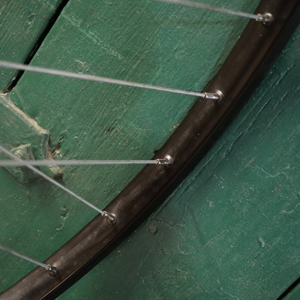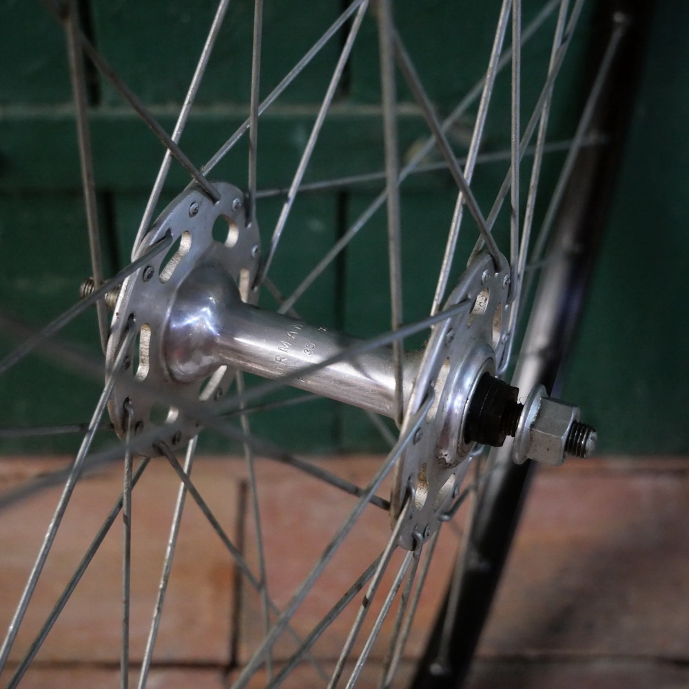 Vorderrad GRÜNERT, 28 Zoll(622), Alu, schwarz, für Drahtreifen, original 1978, Breite ca. 24 mm, NORMANDY Alu- Hochflanschnabe, Einbaumaß ca. 95 mm, 2mm Speichen verzinkt, alte Neuware mit leichten Lagerungsspuren, Zustand gemäß Fotos