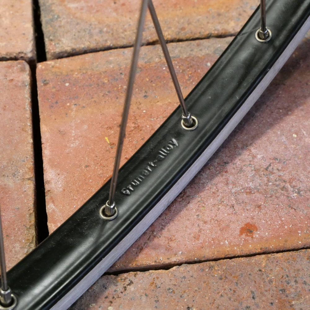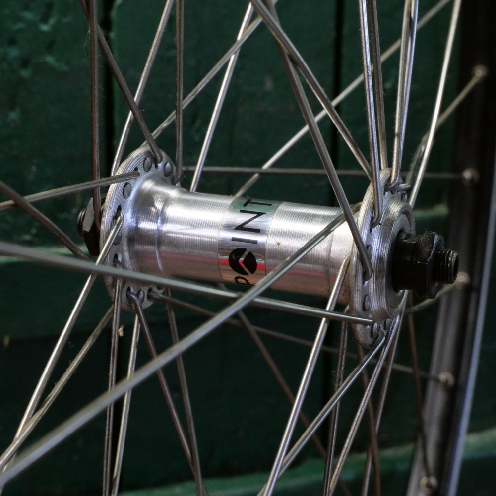 Vorderrad "Grünert", 28 Zoll (622), Alu, Kastenfelge für Drahtreifen, Breite ca. 23 mm, schwarz, Nabe "Point", Alu, für Schnellspanner, Einbaumaß ca. 100 mm, 2 mm Speichen rostfrei, alte Neuware mit leichten Lagerungsspuren gemäß Fotos